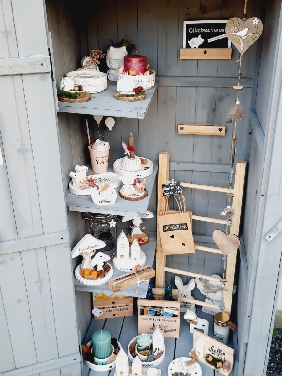 Das Häuschen selbst ist ein charmantes Schränkchen in Häuschenform – klein, aber fein. Es lädt dich ein, in Ruhe zu stöbern und das Passende für dich oder deine Liebsten zu entdecken.