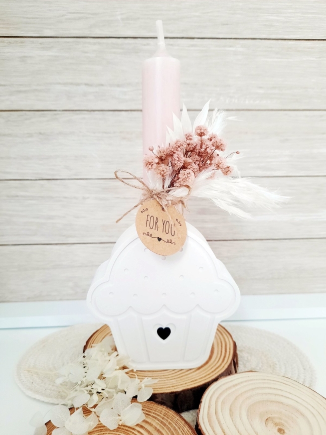 Dieses liebevoll gestaltete Kerzen-Arrangement in Cupcake-Optik ist ein echter Hingucker. Mit zarten Trockenblumen, einem Anhänger „For You“ und einer pastellfarbenen Kerze verziert, eignet es sich ideal als kleines Geschenk oder Mitbringsel zum Geburtstag.