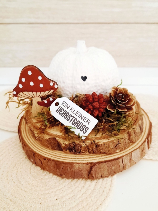 Ein kleiner Herbstgruss zum Verlieben – auf einer Baumscheibe mit Kürbis aus Raysin, Holzpilz und Moos dekoriert. Ein liebevolles Handmade-Unikat und das perfekte Mitbringsel.